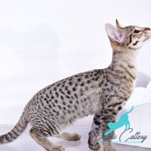 Savannah cats have a unique look that turns heads. With large ears, long legs, and a spotted coat, they resemble their wild ancestors. Each generation, from F1 to F5 Savannah cats, offers a slightly different mix of wild and domestic traits. - Intelligence: